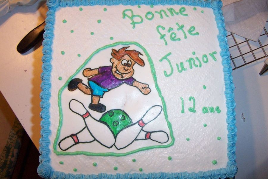 Chocolate cake, for a little bowling fan. He's in the same bowling league as my son. This cake is part of my contract with the bowling ally, I do all their birthday parties cakes. but that little guy wanted a bowler on the cake. My printer was broken so I had to draw the bowler on the wafer paper, wasn't in the mood for a FBCT and I don't have a projector either. Bless those food coloring pens!!!