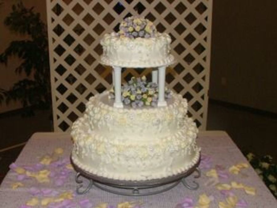 There are royal icing roses all around the top of each cake (probably jsut under 200). The roses are white with 1/3 tinted purple and another 1/3 tinted yellow. There are tiny doves on the cake and the rose buds on the top and in the middle are silk. Thanks for looking!