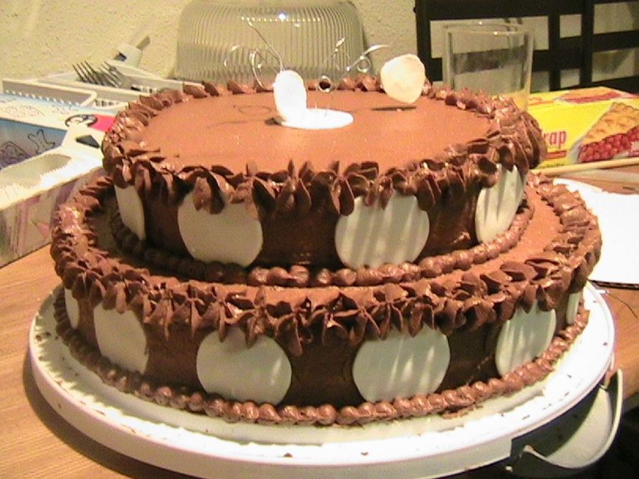 This was a cake I made for my husband's boss's birthday. It is a 12" and 9". The bottom layer is german chocolate cake with cream cheese filling and the top layer is vanilla with cream cheese filling. The whole thing is iced in chocolate buttercream and the circles are mmf.