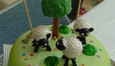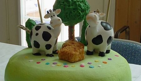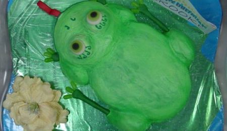 Yellow sour cream cake with buttercream filling and icing. The apple on top is two mini bundt pans and the apple was hand painted after the buttercream crusted. The leaf and steam are tootsie rolls. Marzipan fruits decorate the sides and yogos are the large bead decorations. This was for a kitchen themed bridal shower.
