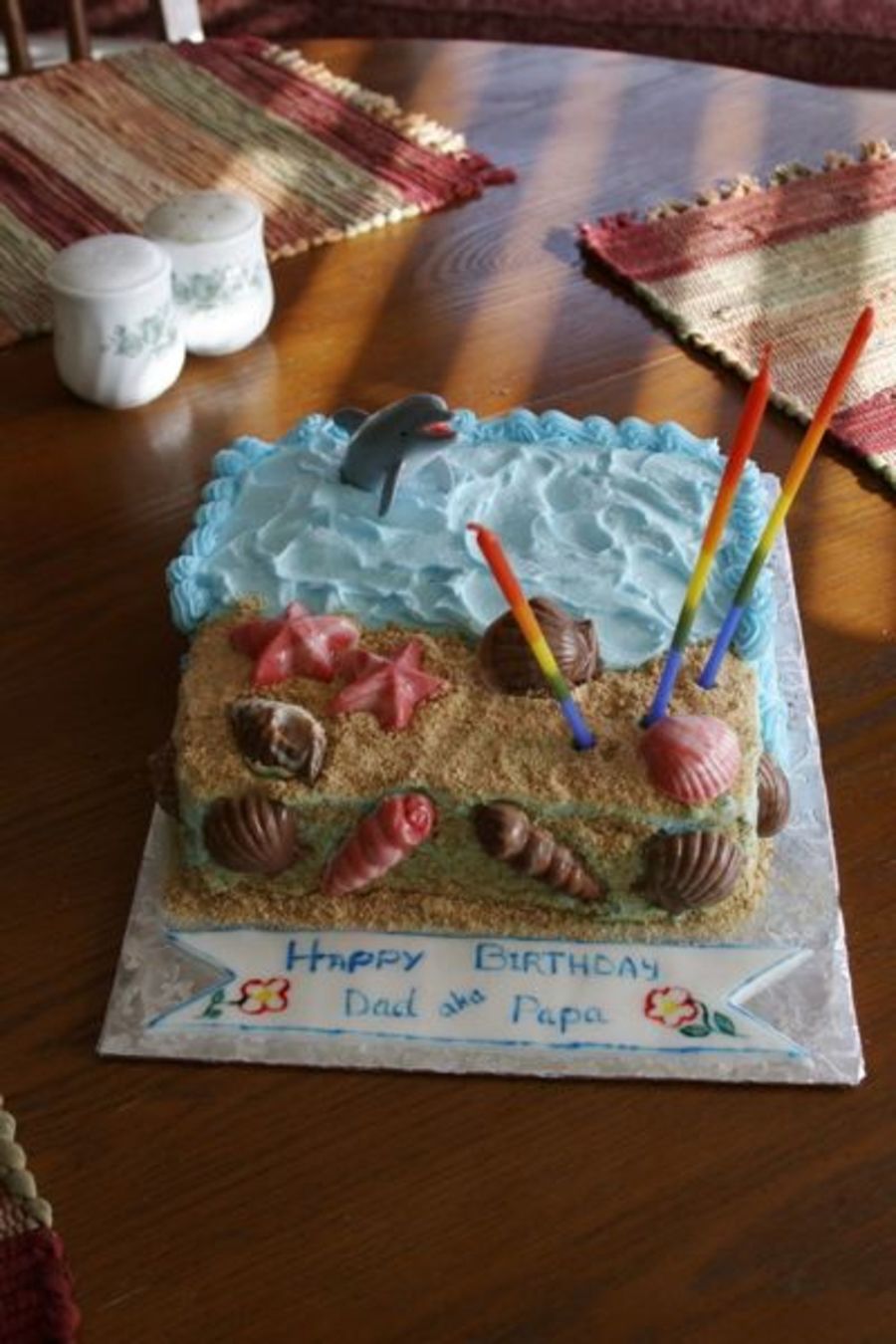 The cake is chocolate w/buttercream (w/almond twist) icing. The banner is fondant decorated with edible markers. The shells are marbled chocolate. The dolphin is not edible. I found it at Michaels and thought it would be cute jumping out of the "ocean" of icing. The candles represent tiki torches and are rainbow just like the rainbows you see in Hawaii.