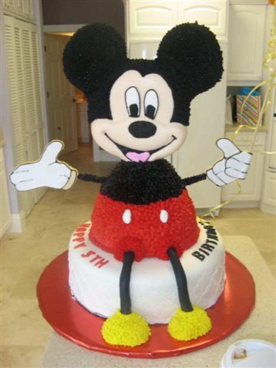 This is an absolutely enormous cake, too bad I cannot have people next to it to show the scale. The bottom tier is a 14" round, Mickey's body is Wondermold + 9" round. Head is melted candy melts poured in the Mickey cake pan. Hands are cookies. Got the idea from Wilton's '06 yearbook but had to come up with my own construction as I did not have access to the materials needed.