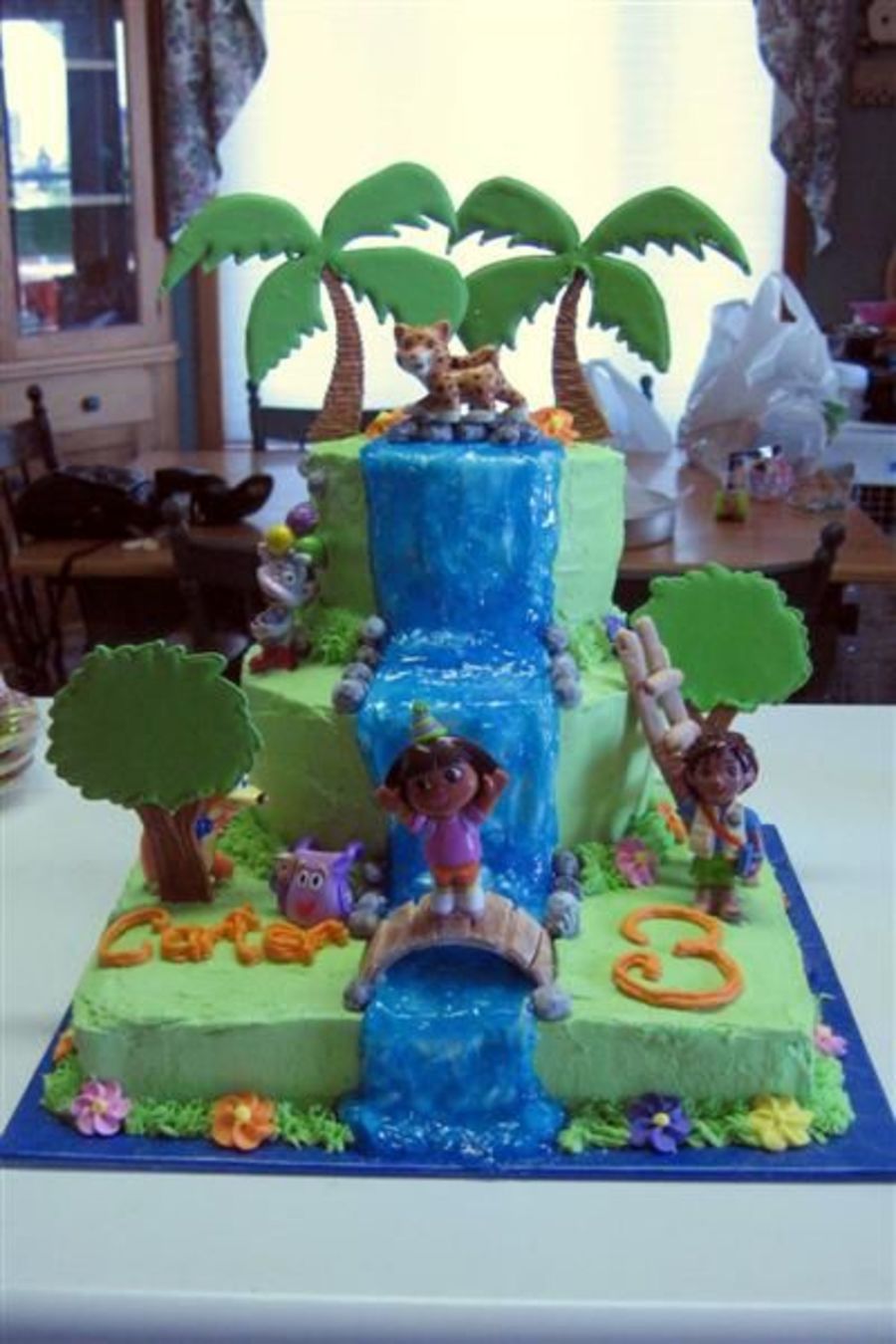 This cake took forever, but I was so happy with the way it turned out. Marshmallow fondant "rocks", gumpaste bridge and ladder, colour flow trees, and piping gel tinted blue for the waterfall. The characters were the little boys whom the cake was for. So much fun to decorate!!!