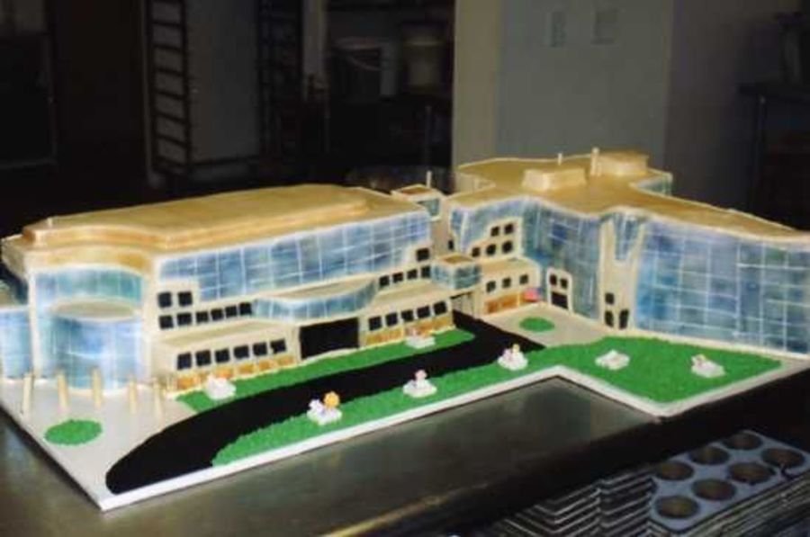 Replica of a university hospital building "The Point". Made from 4 full sheet cakes. Buttercream with fondant details.