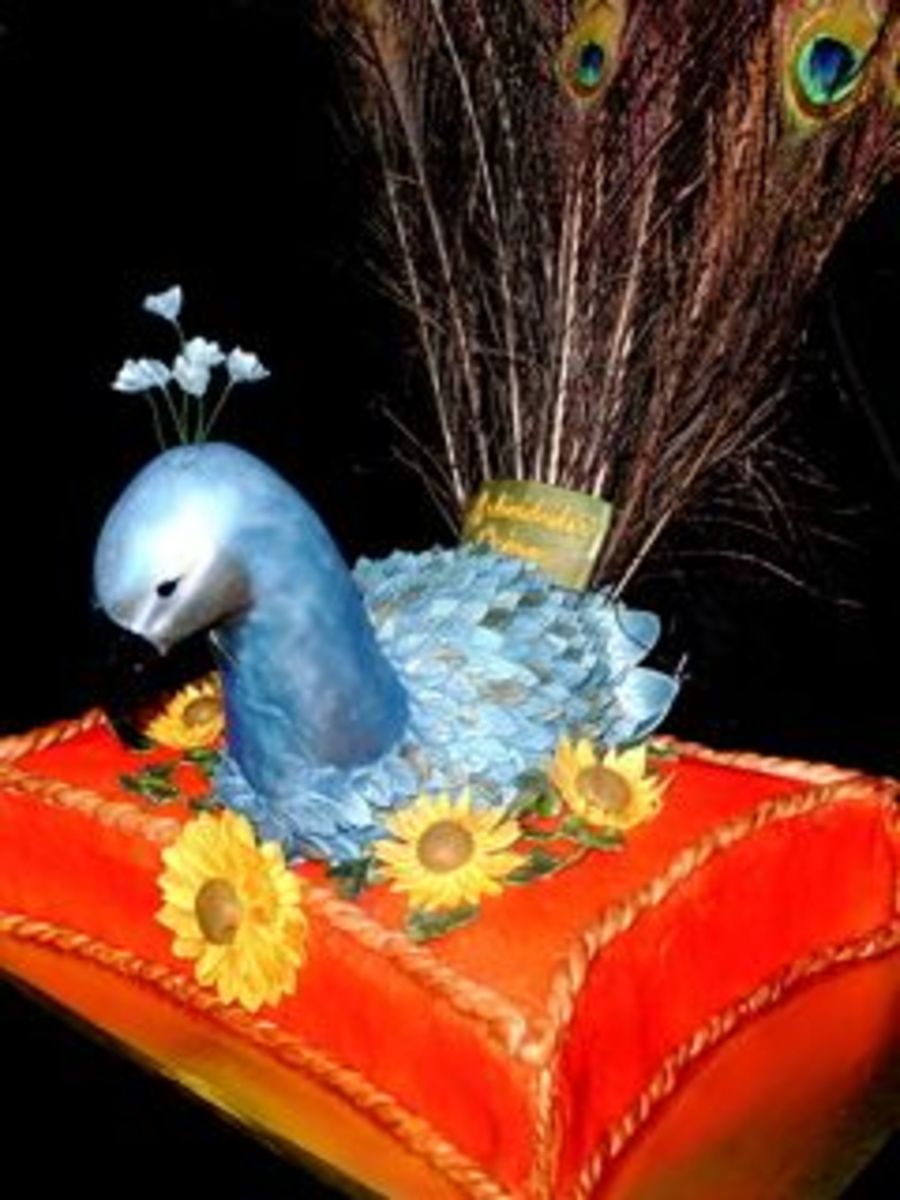 I didn't have time to explain how I did this when I loaded it Made about 250 feathers w/ the rose leaf cutter, used toothpick to give definition. Alll flowers and leaves are sugar paste. The head and neck are rice crispy treats covered with fondant. Cake was airbrushed. Rope border is fondant painted with bronze luster dust. bird, feathers, and flowers are all painted w/ luster dust. Tail feathers are real. Steamed them and wrapped ends with foil then suck into cake.