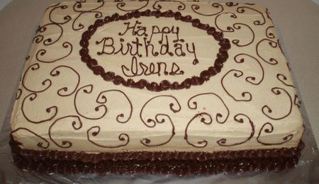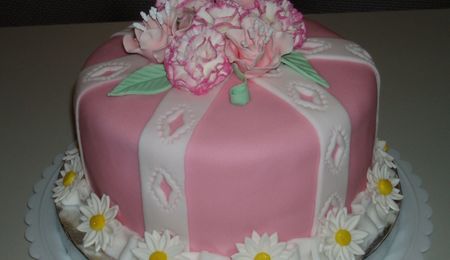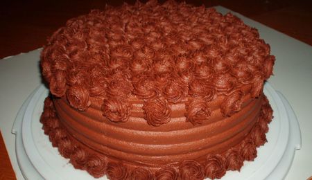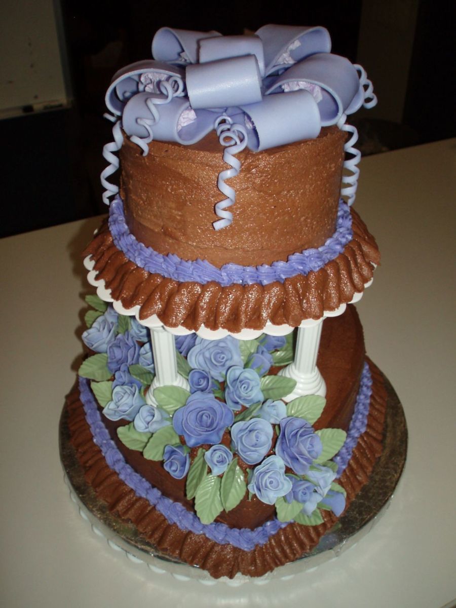This is a fudge cake with chocolate buttercream. The roses are purple (in the picture they look blue) gumpaste and the bow is fondant. It was my first attempt at a tiered cake.