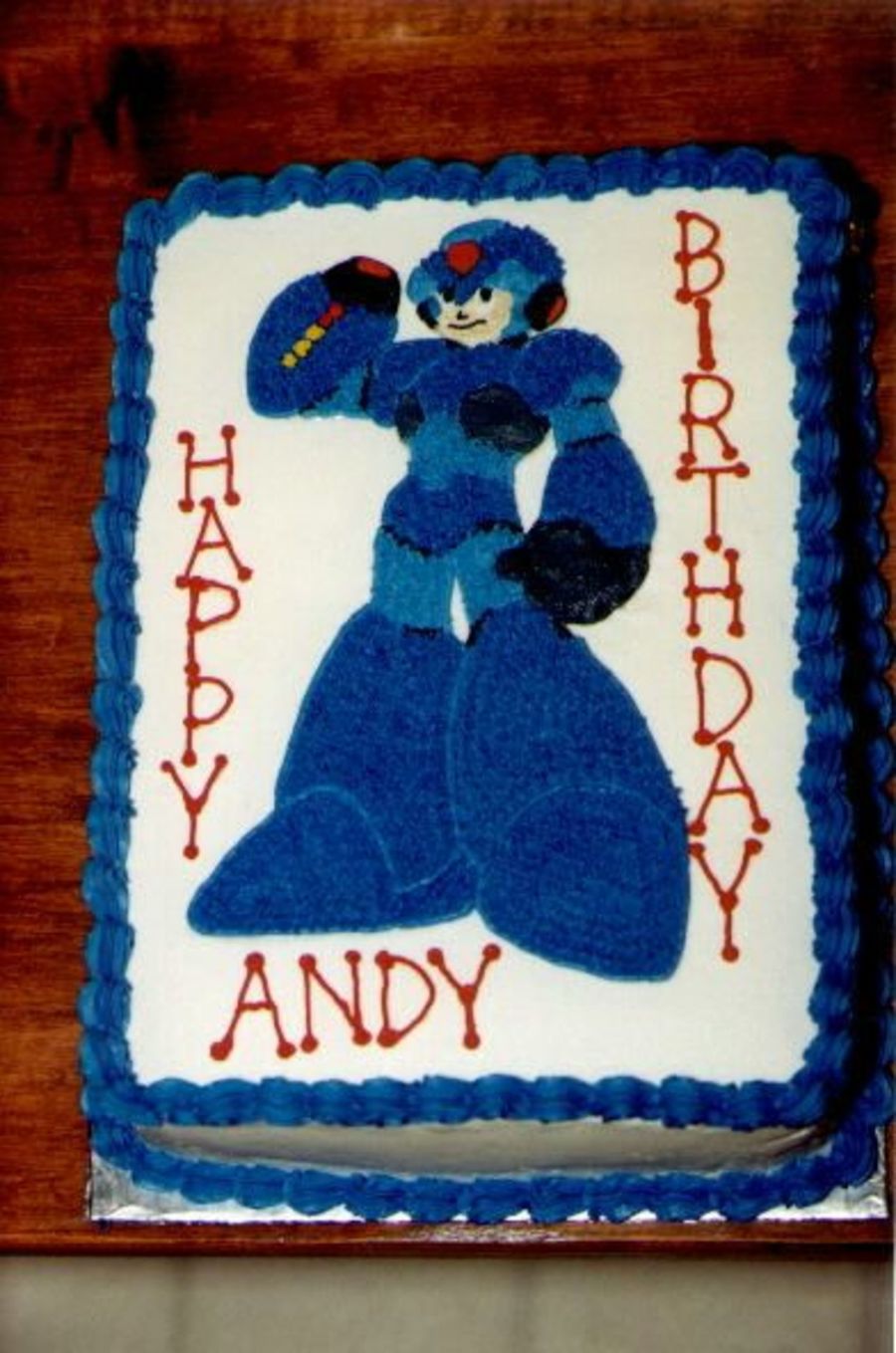 This was a popular character about 5 years ago. Cake is iced smooth with buttercream. Image was transferred on using piping gel. Mega Man was decorated using buttercream.