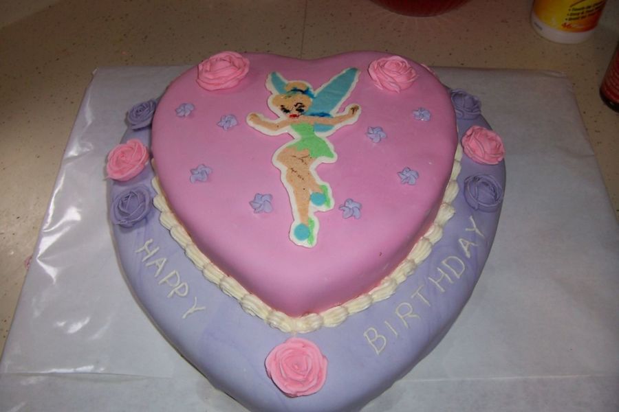 2 layer heart shaped chocolate cake. Cream cheese frosting in between layers. MMF covered. Tinker Bell is FBCT. BC Roses. Due to how her face turned out, I had to give her plastic surgery which I forgot to take a picture of after the fact. The photo that I used for the the transefer, I was able to cut out her face and place it accordingly. The cake is 14x12x6..