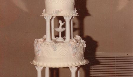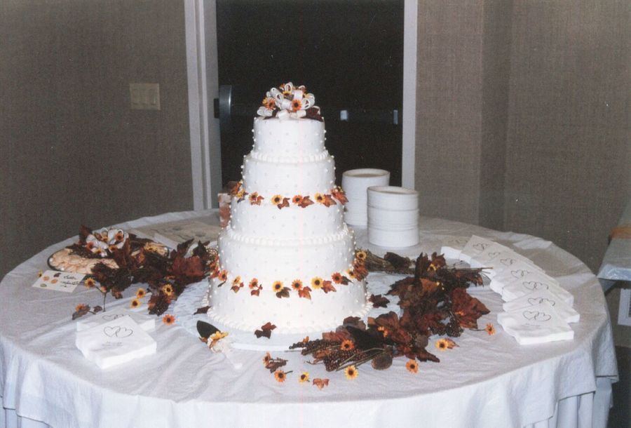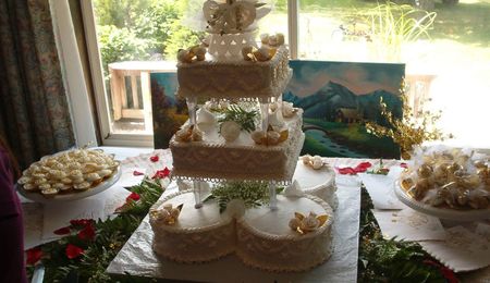 Fondant pearls. Fondant bow. Slik flowers that the bride brought to me. Marble cake and buttercream icing.