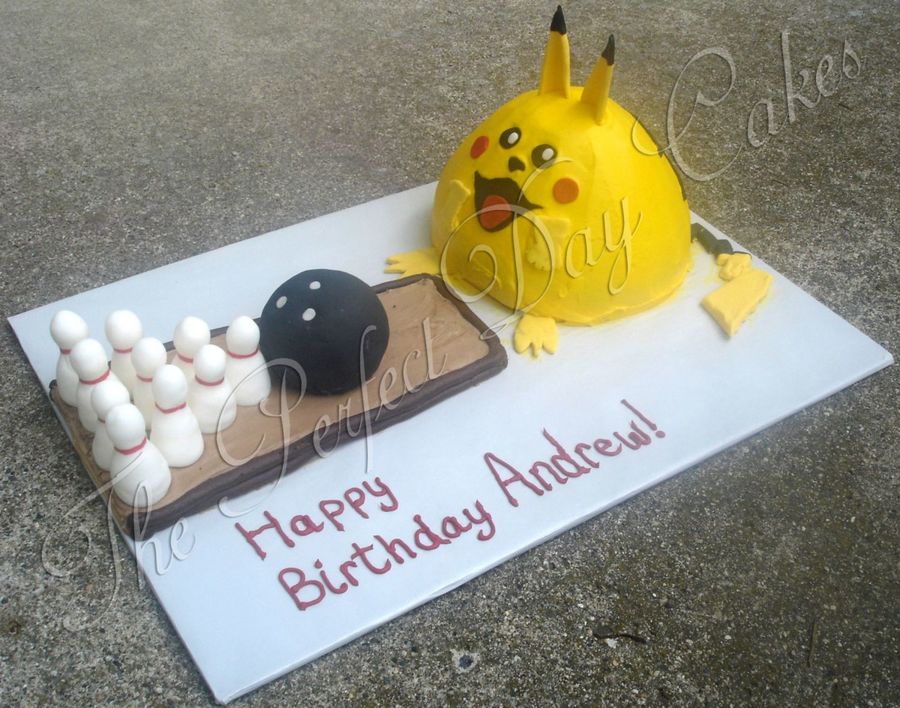 Made for my nephews birthday, which took place at a bowling alley. Pikachu was a chocolate cake with buttercream icing and fondant accents. The bowling ball was a white cake, all fondant. Bowling pins were all hand molded. The bowling alley is a NFSC with icing on top.