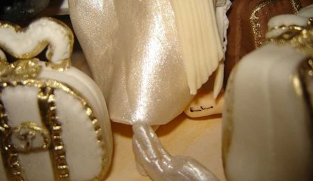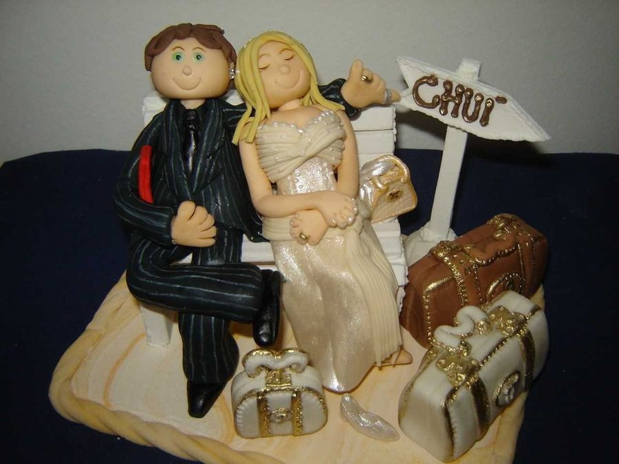 I made them for a such cute couple, Talita and Elmo. The characters were the same clothes of the wedding cerimony. I tried to put many details such bride loves to sleep, the groom always make this gesture with his fingers when take pictures, he uses ears rings, the suitcases and hand bags shows they are moving to a little city at the extreme south of Brazil. They loved the scene...