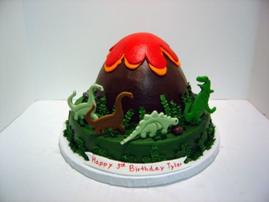 Same design most have seen, volcano, wonder mold, 12" round base. fondant dinos, candy rocks.