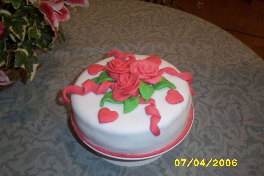 This is the first cake I've made with fondant. Its red velvet with butter cream fill. All decorations are made of fondant. Roses, leaves, hearts and curls are all hand made.