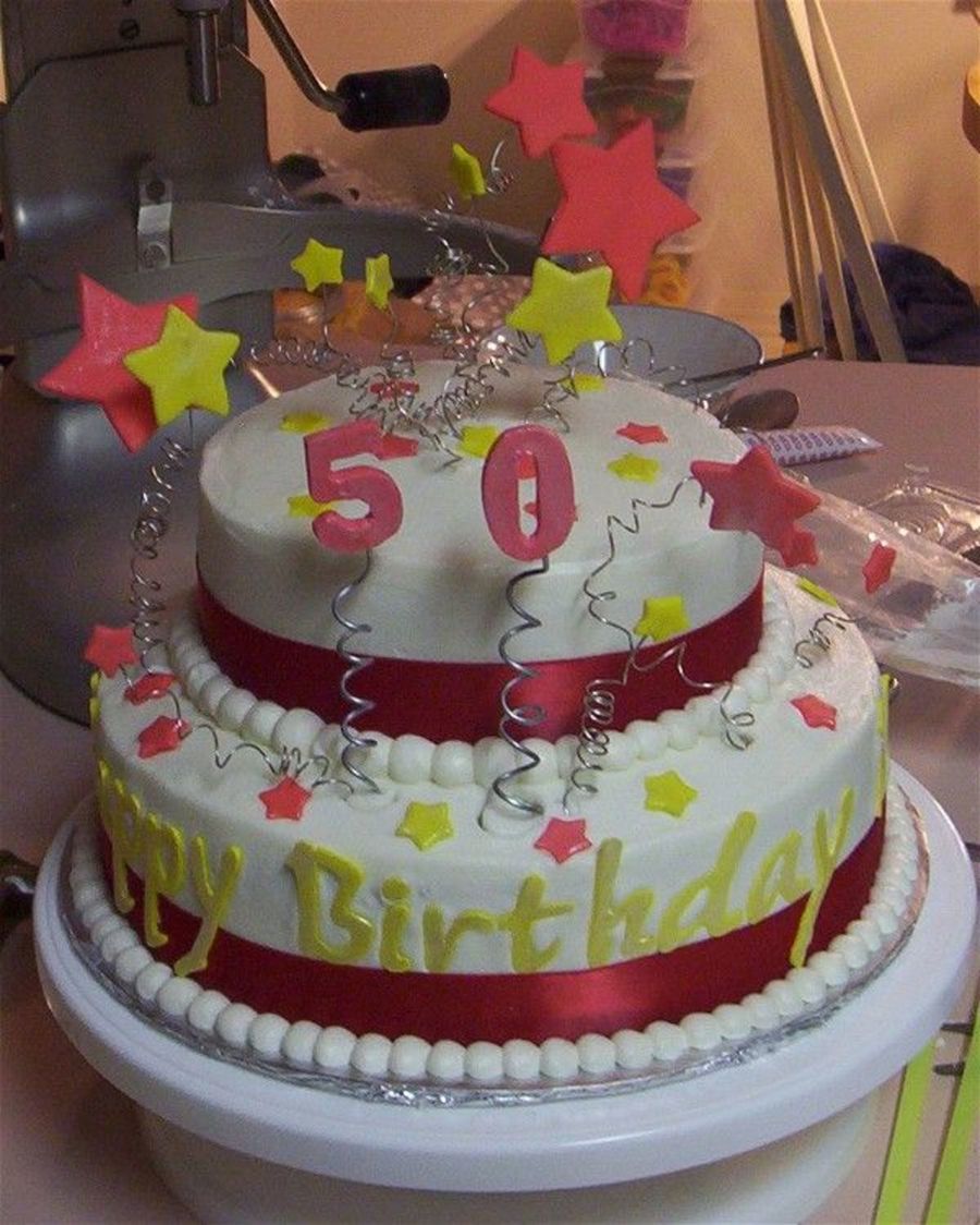 Cake made for a co-worker's mom. Top tier is vanilla cake, bottom is classic white cake. I backed the ribbon with the Glad seal wrap stuff. Finished this at 4am. Pretty pleased! LOL..fondant stars and lettering, w/regular buttercream icing.