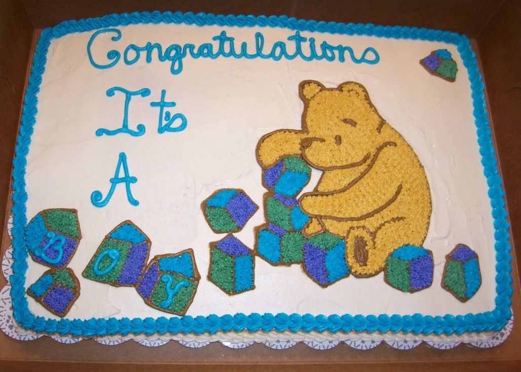 I made this cake for a Baby Shower at work. The Mommy to Be loves classic Pooh!! It is an 12x18 sheet cake and I traced the picture of Pooh. It has been very humid in my area the past few weeks and it have given me some icing issues!!