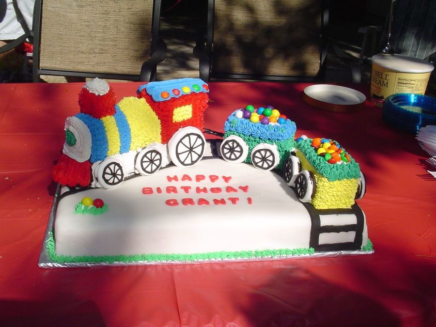 great cake! I love the train and it must not have been easy to cover the rectamgle cake in fondant! Great job!