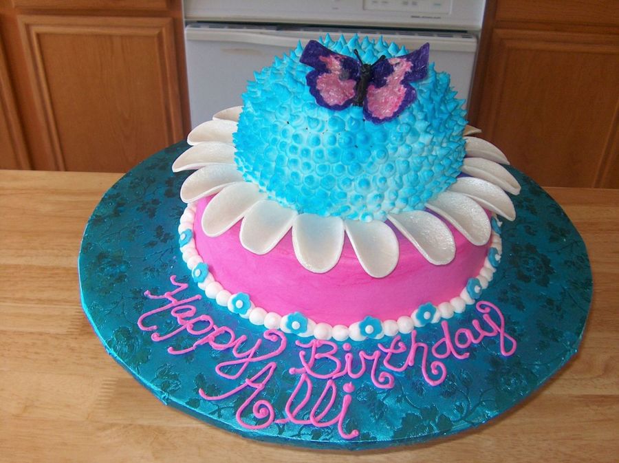 This is a cake I did for my niece for her 7th birthday. She sent me a similar picture she found on the internet. I changed it up a bit with different colors and a little different design. She loved it. Very fun cake to make. Petals are made out of gumpaste and painted with luster dust. I made the butterfly using the directions on this site.