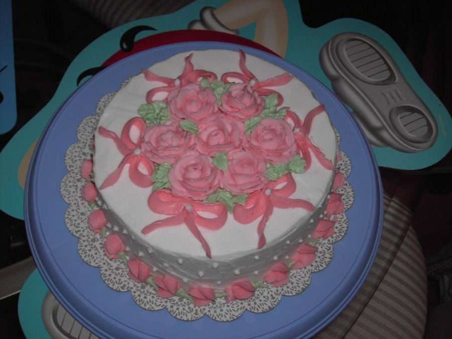 This was my final cake, tried to use all the techniques that we learned that day...and I guess it looked pretty good because I just found out that my husband's coworker wants to order a 10" version of it for this Sunday for a bridal shower! My first cake order!