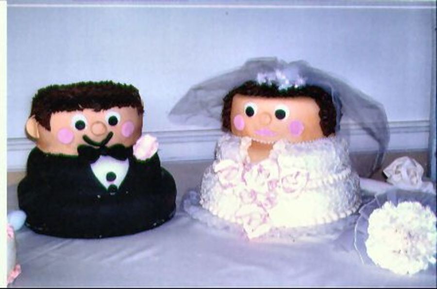 This cake was a lot of fun to make! The Bride wanted something different and this hit the spot! Bride is Marble base filled with french vanilla cream filling - second tier is Chocolate Chocolate Chip with chocolate mousse filling and the faces are done in an Orange Delight. All cakes iced with buttercream and fondant covered - the Groom is the reverse of the Bride.