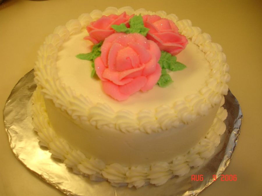 This is the 2nd cake I decorated today during a typhoon. I thought I'd use this day to practice what I have learned in class. My roses are definitely improving. so there's still hope! LOL. I used tip 104 and sprinkled glitter on the rose. Thanks for looking.