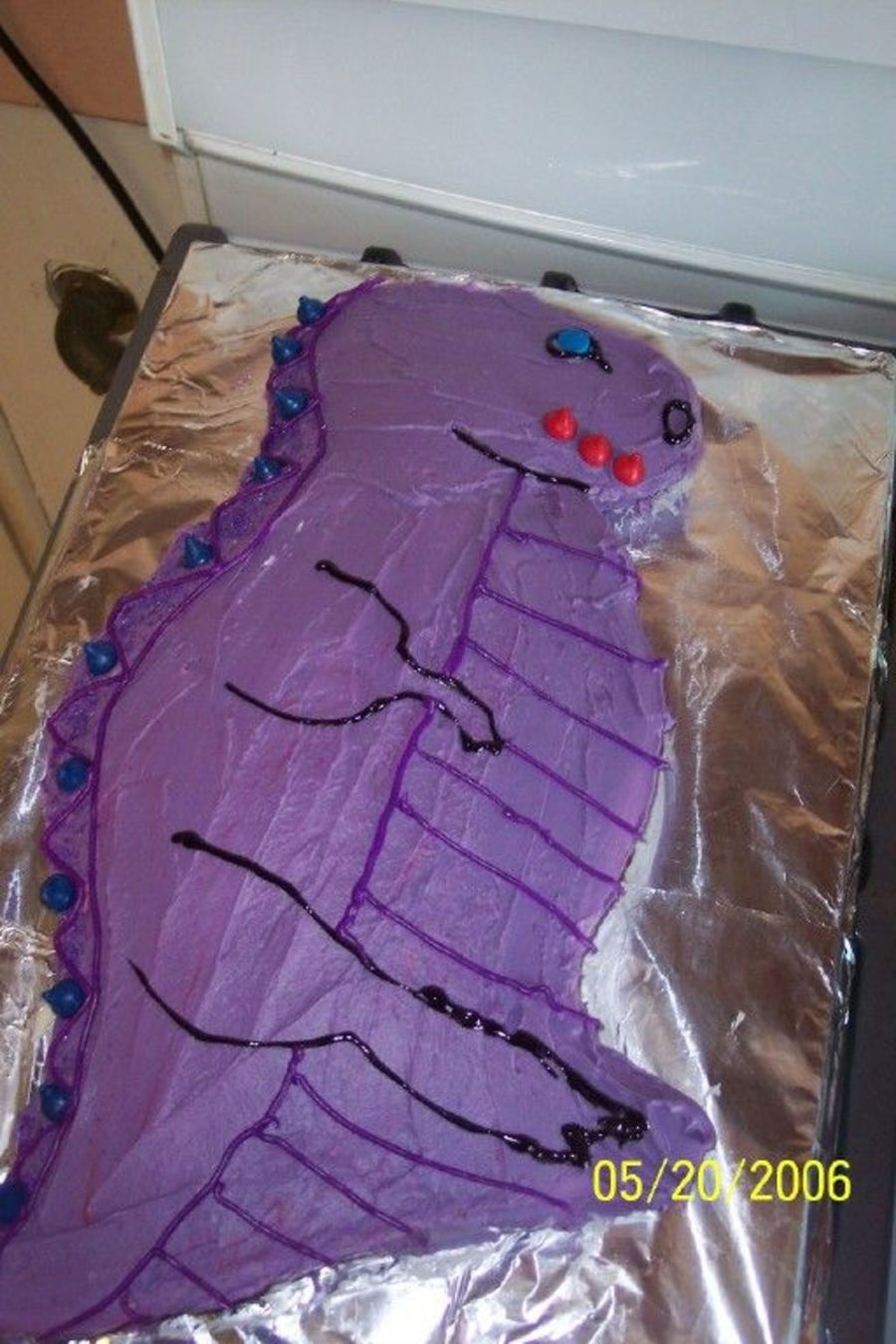 Used the partysaurus pan and gel icing for the details. Hersey Kissables for the spikes.