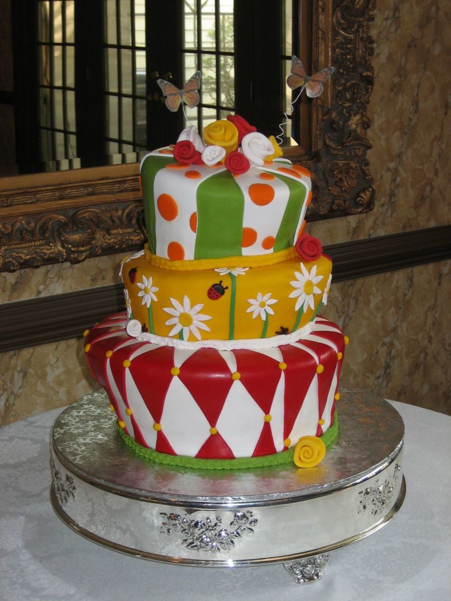 12-9-6 Topsy Turvy Cake. Inspired by colors of nature, the bride is a Botanist. Apple Red, Daffodil Yellow, Granny Smith Apple Green, Carrot Orange with Daisies, lady bugs and butterflies. All elements made with rolled fondant or gum paste with the exception of the dots and antenae for the lady bugs.