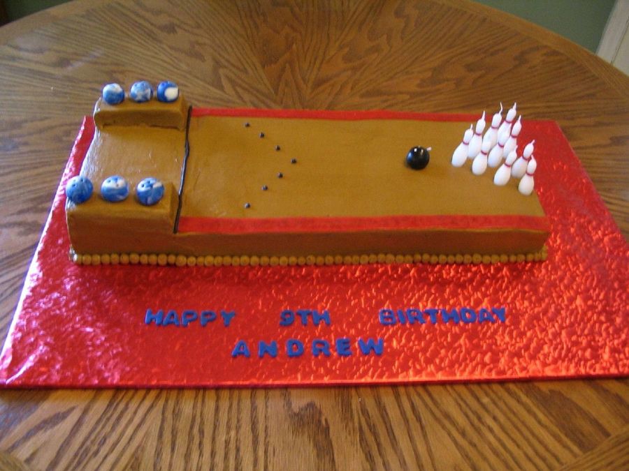 This is two 9x13 chocolate cakes placed end to end. I cut the second one about 3/4 of the way down. The "ball return" is made of pieces cut from the remainder of the cake. The blue and white bowling balls are fondant and the black bowling ball and pins are candles.