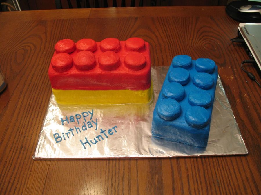 For the double stack of legos I took a 10" square cake and cut it in half and stacked one on half on top of the other. The blue lego is another 1/2 of a 10" square cake. They are iced in buttercream. The "pegs" on top are buttercream iced rice krispie treats.