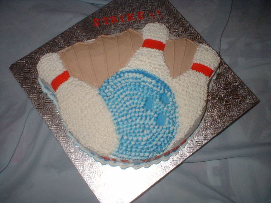 bowling banquet cake for a small local bowling league. The ball is white & 2 shades of blue; border matches colors of the ball; all buttercream.