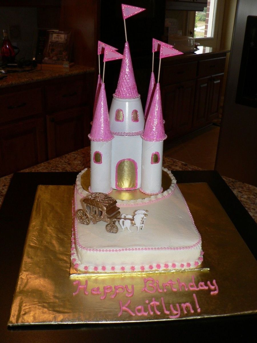 9x13 iced in BC with pink pearl accents. Castle was made ahead of time out of paper towel rolls and ice cream cones that were painted. Paper flags edged in glitter glue and attached with toothpicks. Carriage purchased a wedding supply store. Needed something easy to assemble on party day.