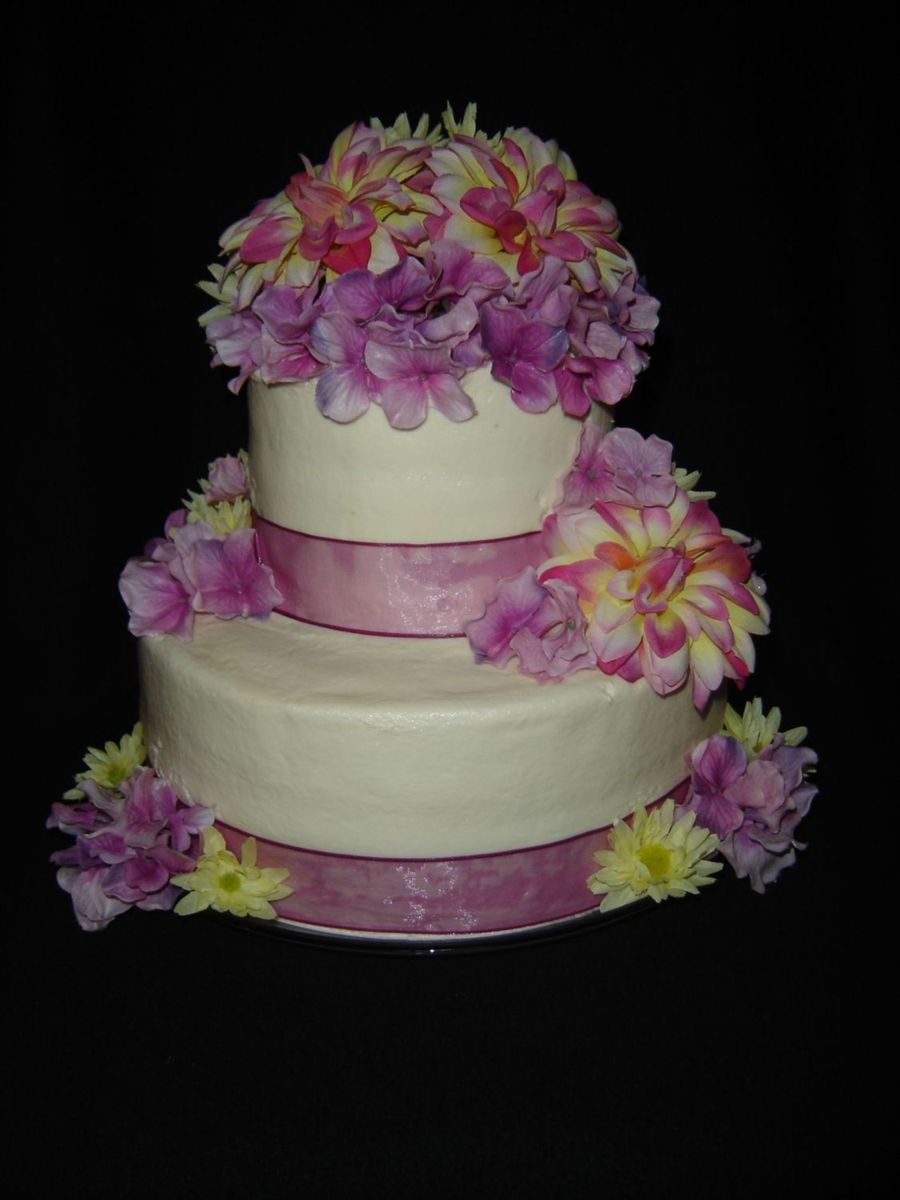 Bride just told me she wanted round 2 tier. Didn't tell me color of flowers or anything, so I had to come up with this on my own. The lady at Hobby Lobby didn't give me enough ribbon, so I had to arrange the flowers accordingly. I like the colors, came out ok for not knowing what the bride wanted. She loved it, thats all that matters!
