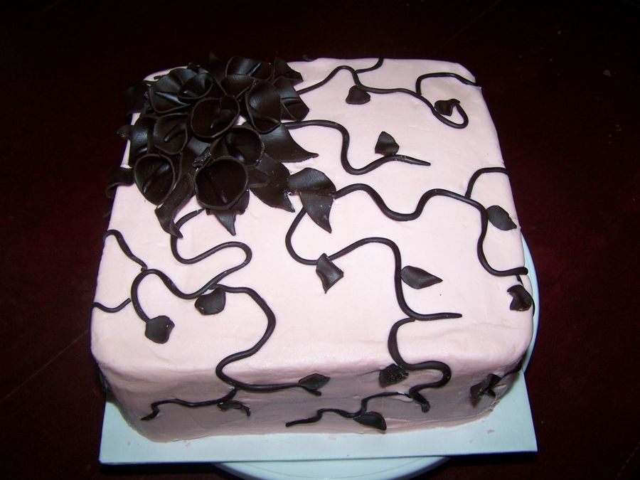 Cake frosted in pale pink with chocolate calla lillies and vines