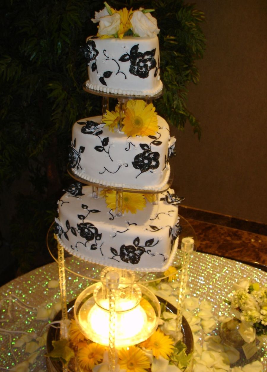12-9-6 heart shape wedding cake. All cakes covered in white rolled fondant. Black brushed embroidery vine and leaf designs on cake with mini 5 petal flowers and buds as accents. Dimensional 5 petal gum paste flowers with black brush embroidery designs attached with royal icing. Twisted pillar construction with fountain set up. This was the most different cake I have ever made and one of the most challenging because of the black on the white--no room for mistakes since the black stains the white fondant