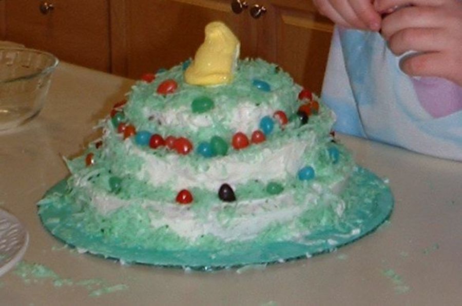 The finished cake for her contest for school. Marshmallow peep is on top. It was judged, then given away as a prize in the cake walk at the spring carnival. There were some awesome cakes there, but many were NOT decorated by kids like they should've been!!!