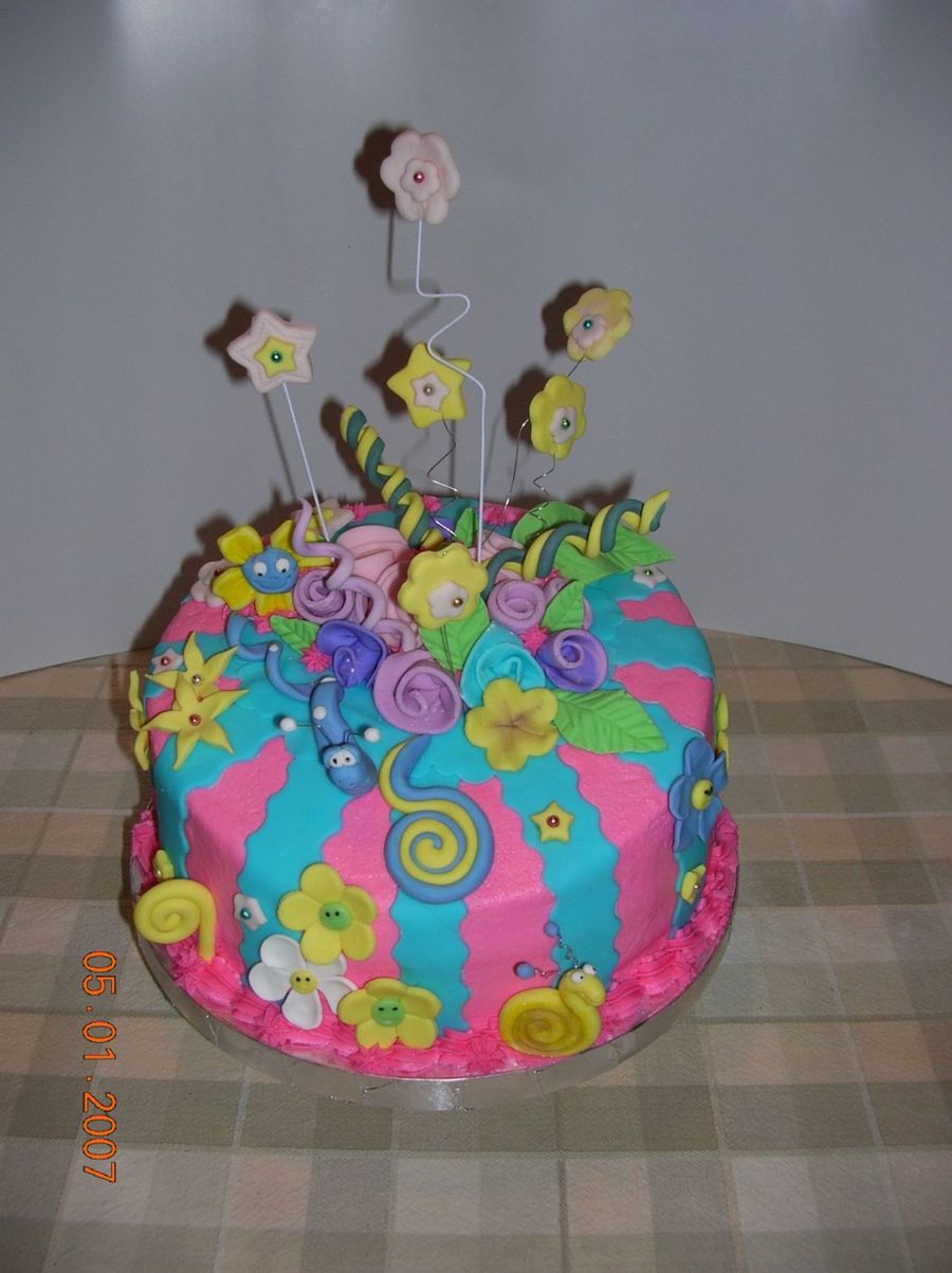 This is my first attempt at a Whimsey cake. I made a 1 tier just to see if I could do it. This one went to my Tenant. And she loved it. Was white cake with raspberry buttercream filling and fondant designs.
