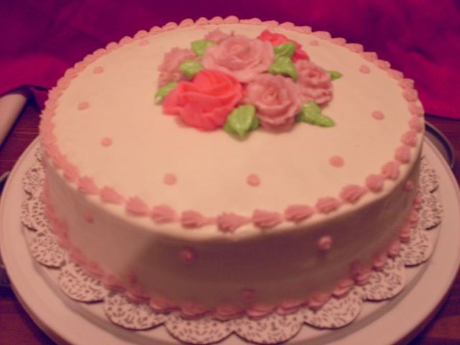 My final exam cake!! Oh man my roses were terrible! One of my class mates was nice enough to make a couple for me (the dark pink), and my instructor made the center one. If not for them it would have taken me all day to get 7decent roses. Back to the practice board lol. This was a butter cake with apricot filling and BC icing.