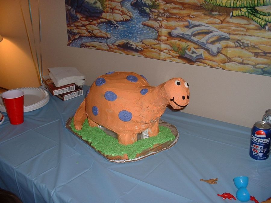 The neck, head and tail were made from rice krispie treats, and the base of the cake is a styrofoam board, with styrofoam eggs glued on for legs. The body is cake. The whole thing is covered in buttercream.