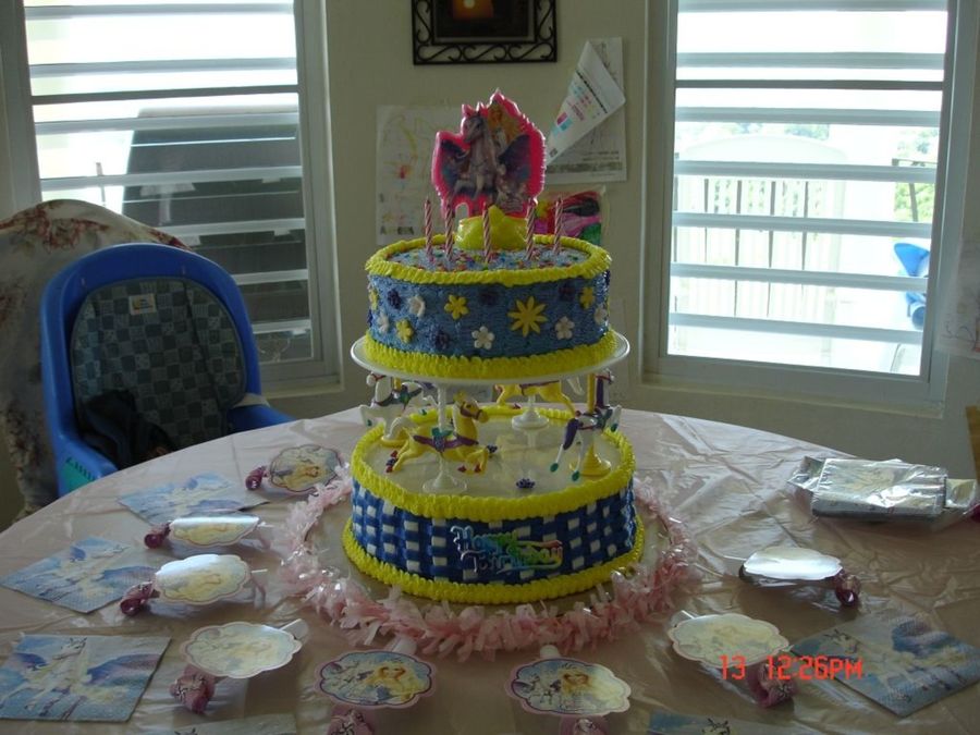 I made this cake for a friend 5 years old daughter. This is a 10" round chocolate cake and a 8" round vanilla cake. She love it.