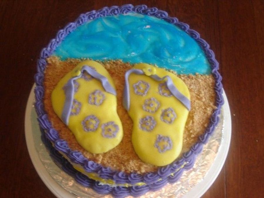 This was to celebrate the end of the school year. Made it for my niece and nephew. French Vanilla cake with BC icing. Sugar cookie's covered in fondant for the flip flops and crushed graham crackers for the sand. Loved all the flip flop cakes on this site and had to give it a try.