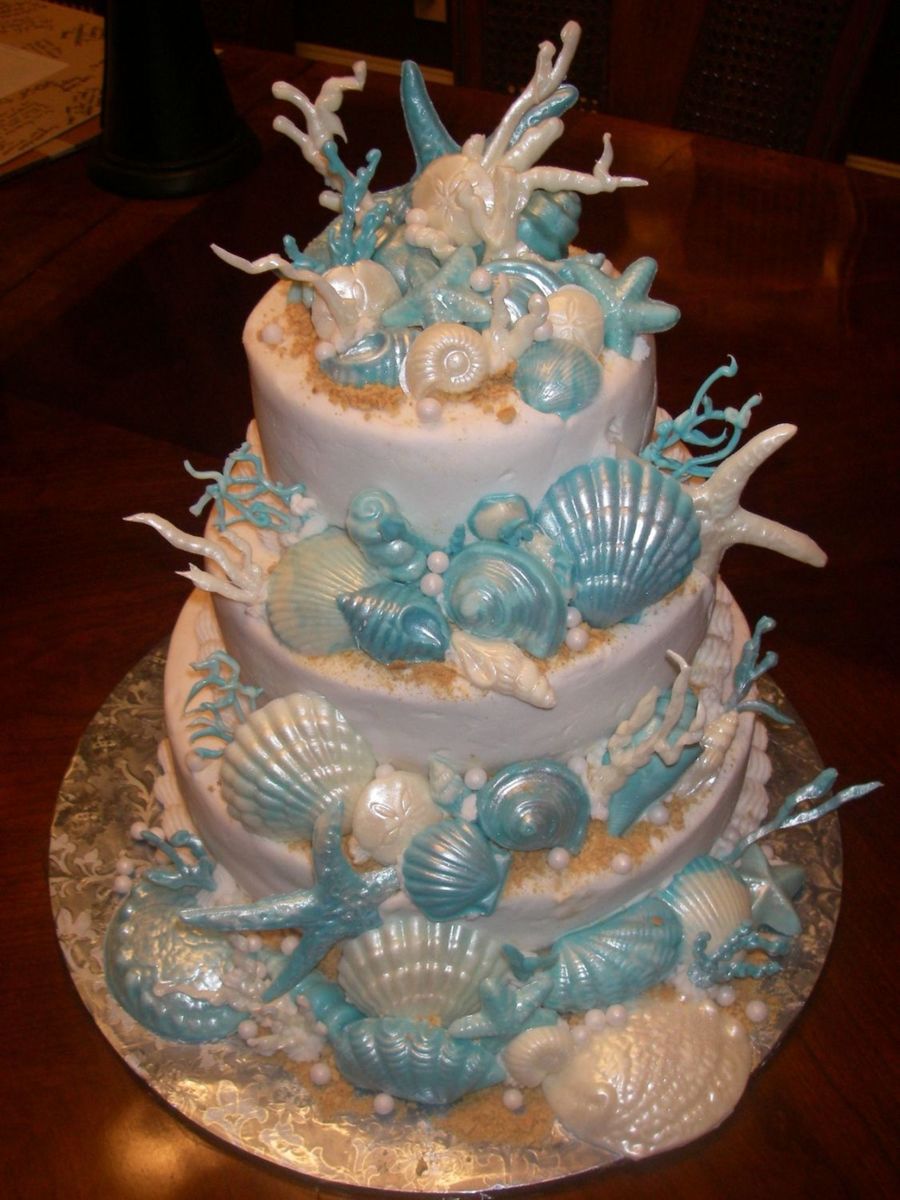 This is a Pina Colada cake with a coconut cream filling, covered with pina colada flavored buttercream, sand is made from crushed graham cracker. Shells are made from white chocolate. This is my first attempt at working with chocolate molds, my first attempt at stacking tiers, and my first attempt at a wedding cake. This is also only the 5th cake I've ever done.. I was super excited with the results!