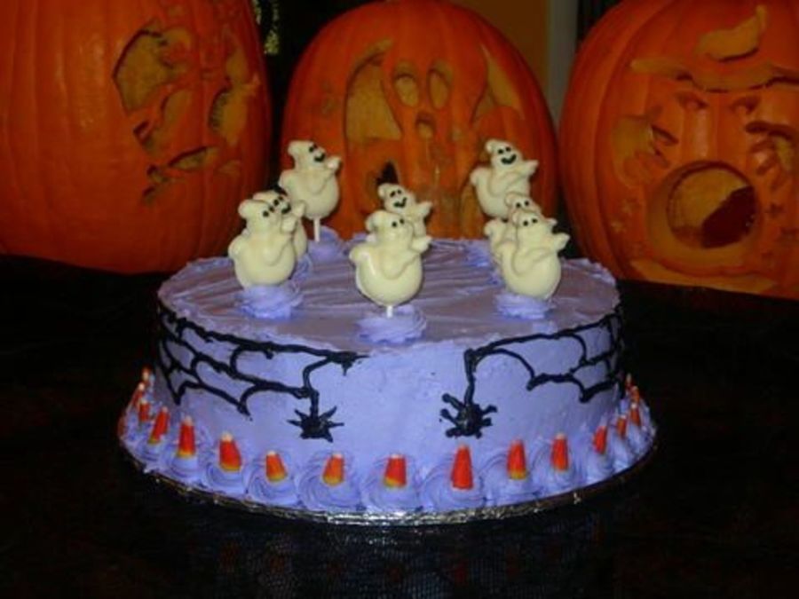 This was a cake for my daughter's class Halloween party. I made the ghosts from white chocolate candy molds.
