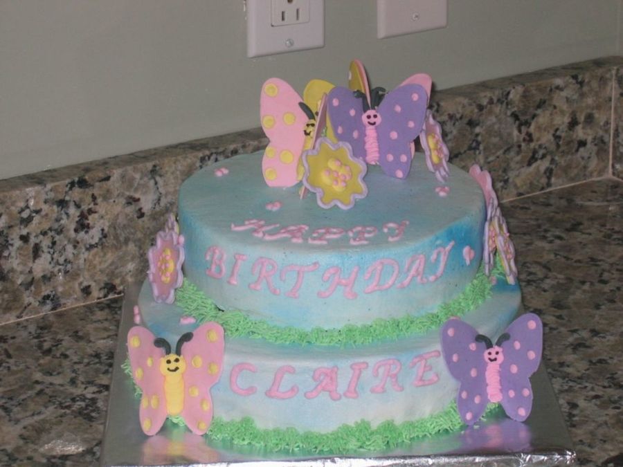 Gumpaste butterflies and flowers with royal icing details. Made this for our realtor's daughters 3rd birthday.