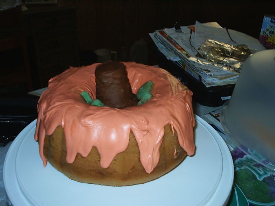 Made just for fun this past Thanksgiving! It's a pumpkin bundt cake. I tinted a good amount of white chocolate candy coating orange and then melted it until it would run down the sides. The center stem is an upside down ice cream cone that I iced with chocolate icing from a can. The green leaves are gumdrops that I flattened and cut out in the right shape.