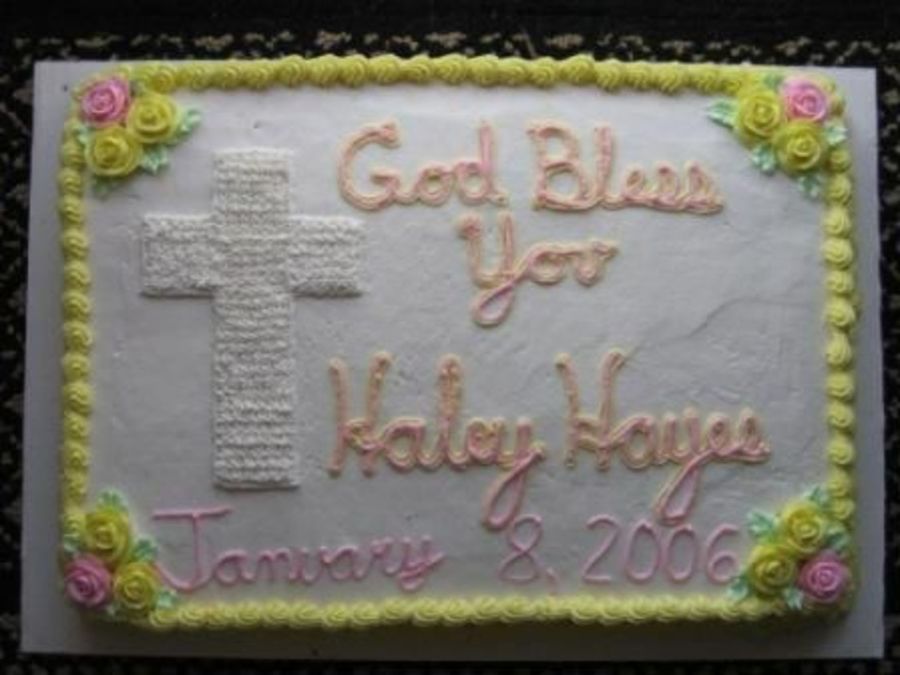 NewbeeBaker on 31 May 2007 , 6:38am Such a precious cake! I love your cross and the roses. Everything(including that nice handwriting) flows together so nicely!