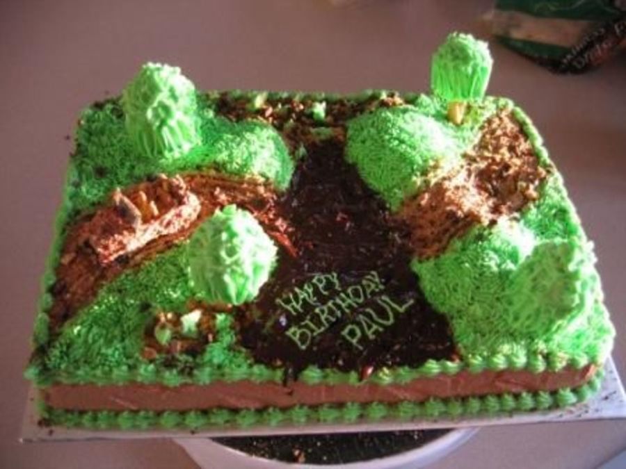All frosting is buttercream. The trees are big marshmellows put on pretzel rods and frosted, the mud puddle and trail are graham cracker crust. The vehicle is a jeep 'mudded' with frosting.
