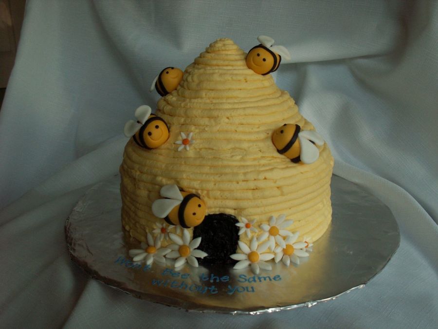I should have check CC before making this cake. If I did, I would have used my Pampered Chef batter bowl! This looks more like a hut tha a bee hive. I used Debbie Browns idea for the bees. This was a going away cake so it says "Won't Bee the same without you".