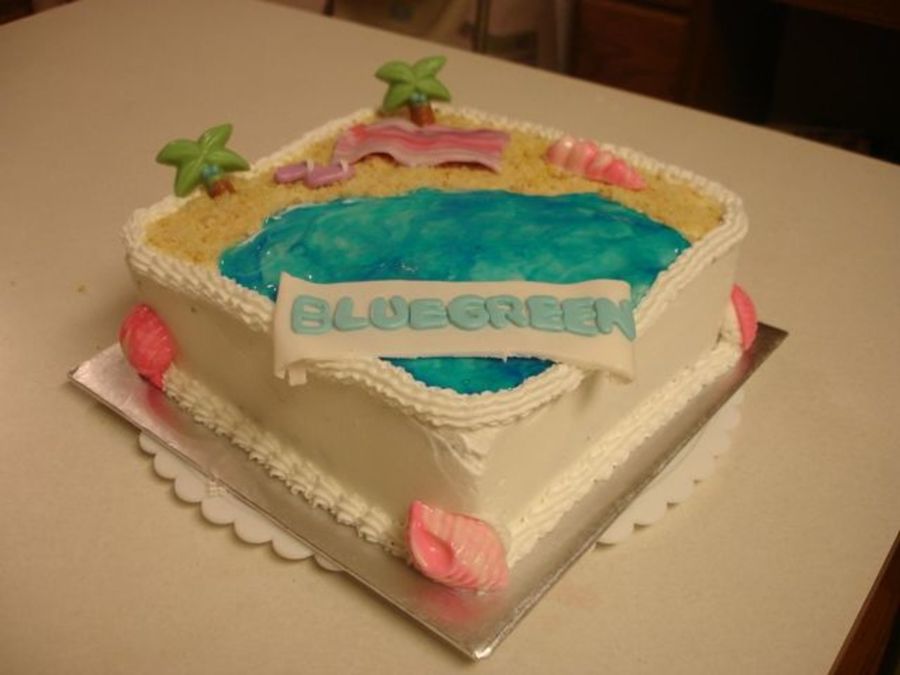 I made this cake just to see if I could do a beach cake...lol. Gave it to my father to bring to work (company name on the sign). trees and shells are chocolate. flip flops, towel and sign are fondant. Cake is Almond Joy with coconut BC. Sand is ground sugar cookies.