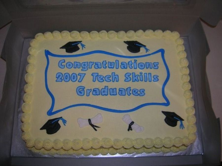 I did this cake for my brother's school for a graduation they were having. It was the first sheet cake I ever did. Bottom layer is chocolate with chocolate BC filling and top layer is French Vanilla, all covered in vanilla nut butter BC. Decorations and letters are Royal Icing