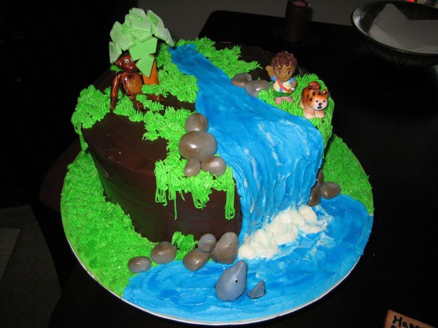 10" round covered in chocolate icing/ buttercream waterfall and grass. Animals fondant and Diego is plastic.
