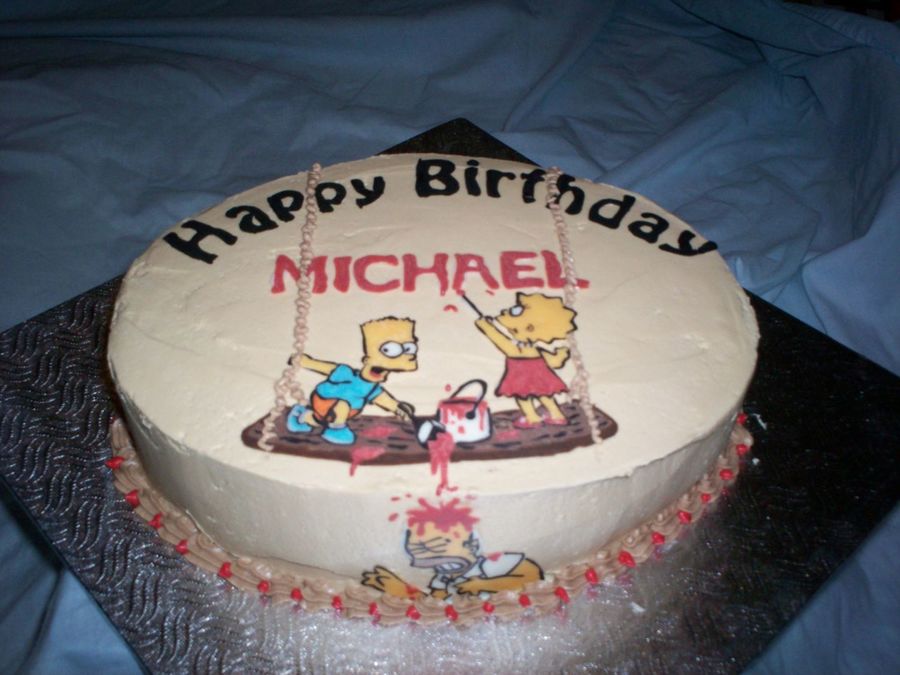 Simpsons painting Happy Birthday sign; Bart spilling paint on Homer.